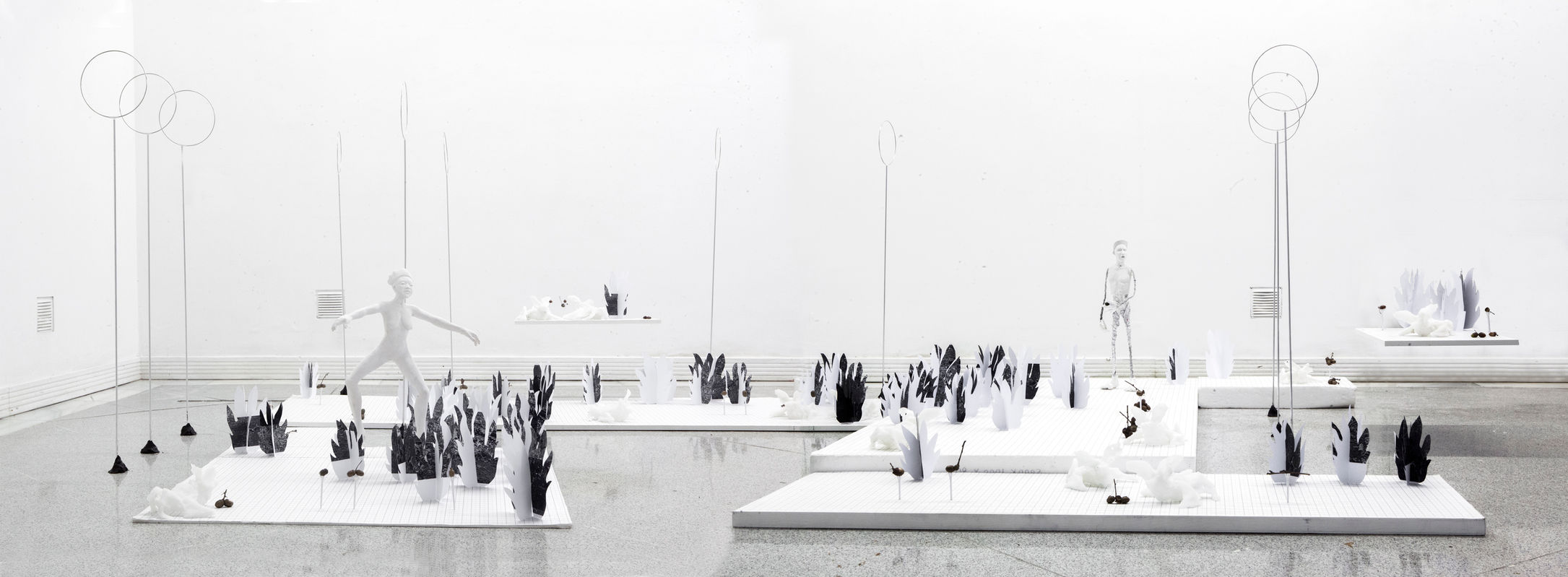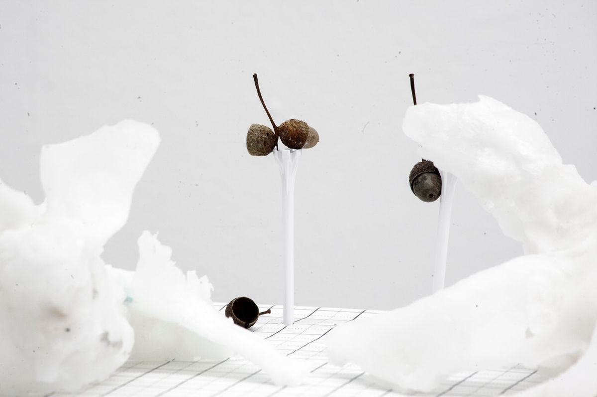 QR* investigates the rendered space of video games displaying an installation on a gridded platform mirroring the screen of 3D software displays. The physical gamespace is inhabited by cutout paper plants and creatures frozen in play. Bats crawl across the surface protecting bronze acorns that are positioned in rows like gold coins. The two avatars also on pause contain a strange sense of animation. QR codes are a matrix like the blueprint of an acorn that creates a complex ecosystem of an oak tree (Quercus Robur). Ancient oak trees are disappearing from our landscape and this piece explores the question of whether we have a role to play in helping or hindering the process. Do we plant or collect seeds for the future? How can we use the devices and contemporary tools, that act as mediators to our experience, to engage with the natural world.